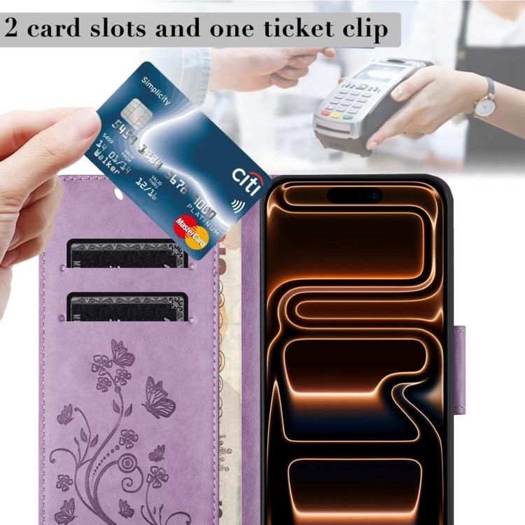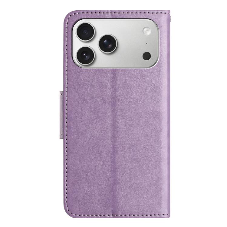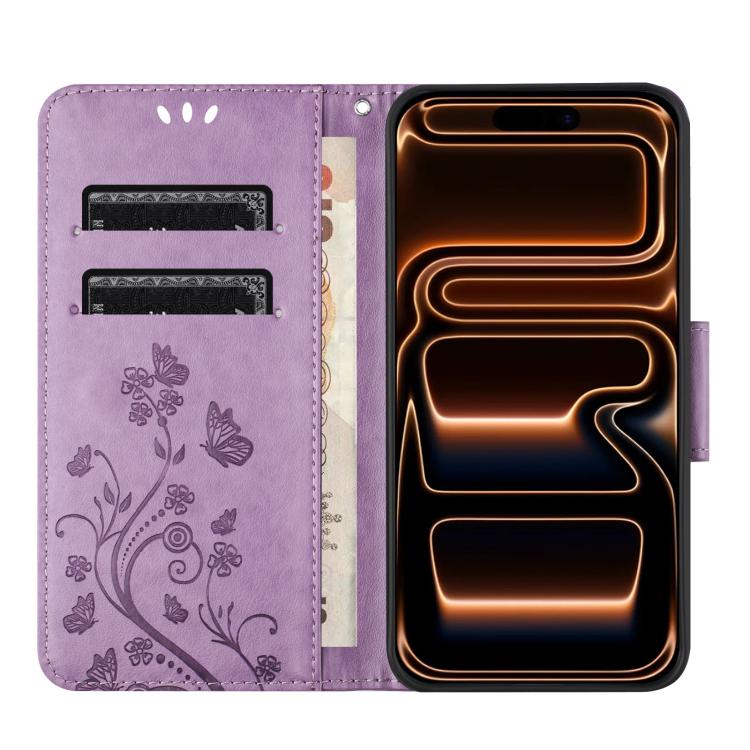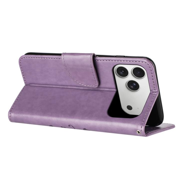 Funda de cuero con tapa para iPhone 17 Pro con diseño de mariposas y flores (morado claro)