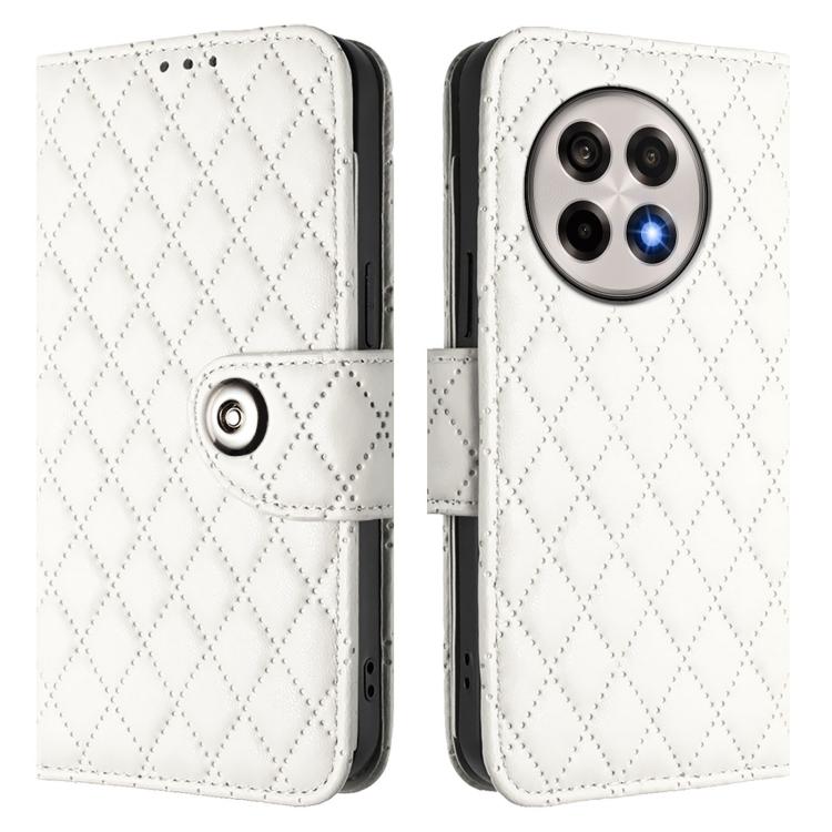 Funda de Cuero con Tapa y Textura Rómbica para OnePlus 13R/Ace 5 Pro 5G con Cordón (Blanco)