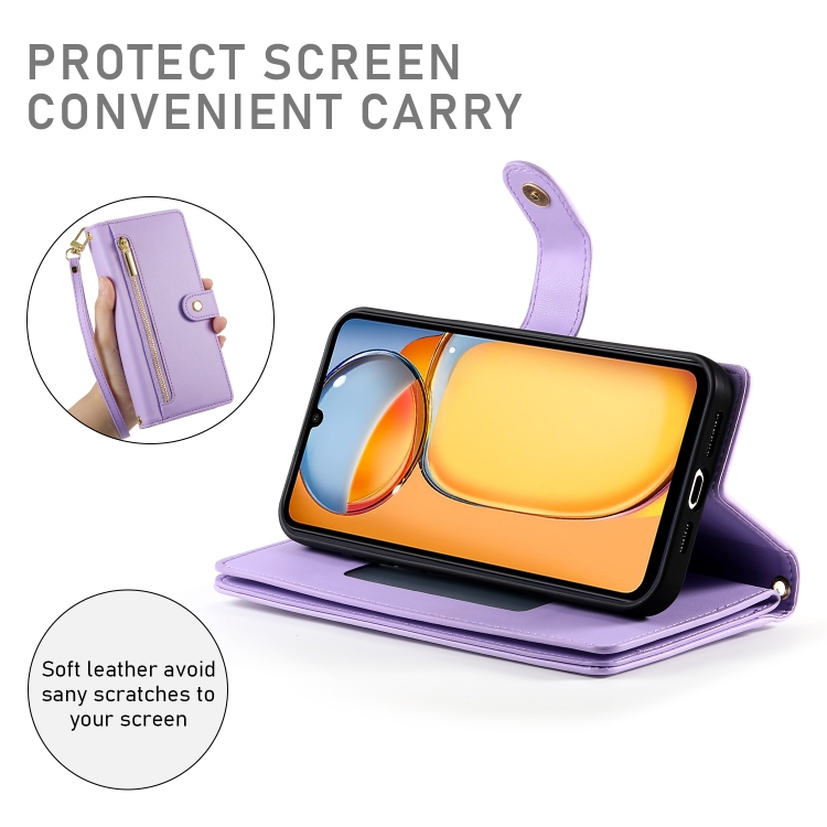 Funda de Cuero para Teléfono con Nueve Ranuras para Tarjetas y Cremallera para Redmi 13C 5G/4G/Xiaomi Poco C65 (Morado)