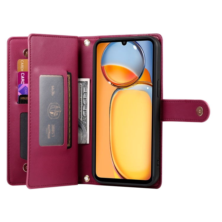 Funda de Cuero para Teléfono con Nueve Ranuras para Tarjetas y Cremallera para Redmi 13C 5G/4G/Xiaomi Poco C65 (Rojo)