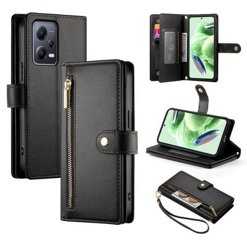 Funda de Cuero para Teléfono con Nueve Ranuras para Tarjetas y Cremallera para Redmi Note 12 5G/Xiaomi Poco X5 (Negro)