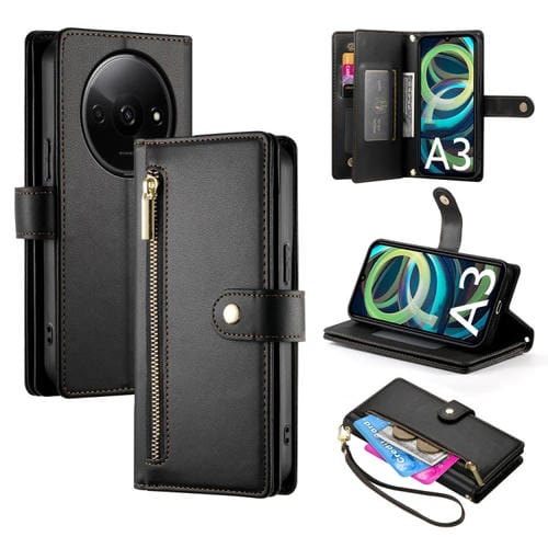 Funda de Cuero para Teléfono Redmi A3 con Nueve Ranuras para Tarjetas y Cremallera (Negra)