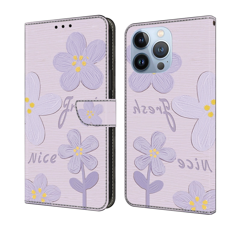 Funda de Cuero para iPhone 16 Pro Pintada a Mano con Pequeñas Flores Lilas