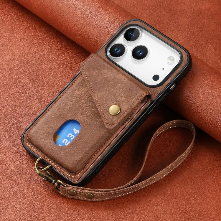 Funda de cuero plegable estilo billetera retro para iPhone 17 Pro con correa (marrón)