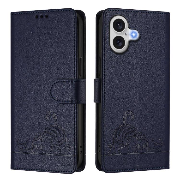 Funda de cuero RFID con estampado de gato y rata en relieve para iPhone 17 con cordón (azul)