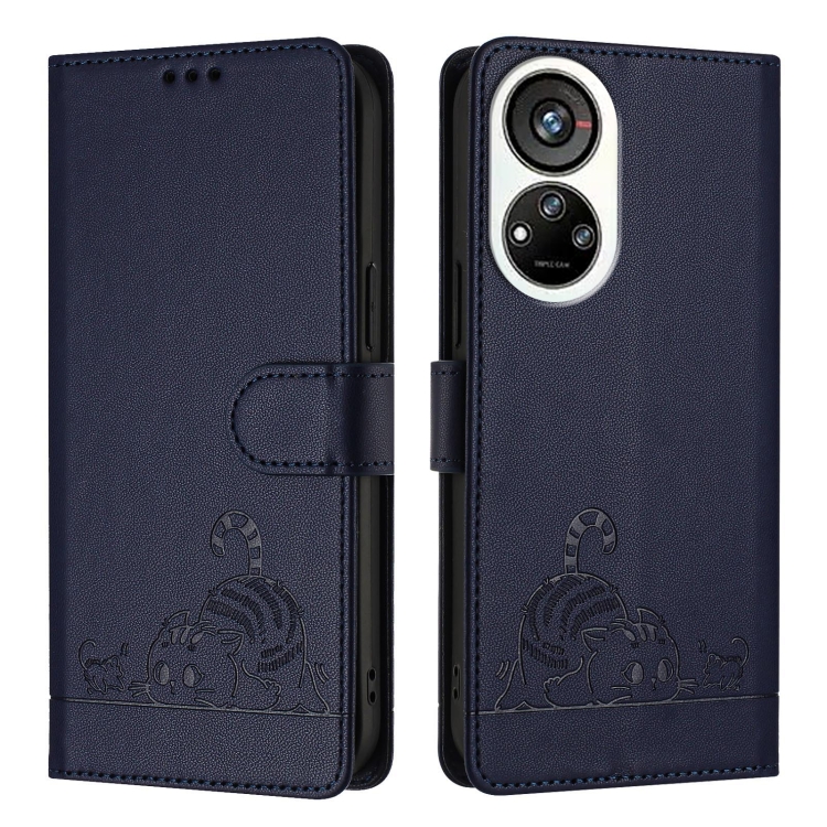 Funda de Cuero Rfid para ZTE Blade V40S con Estampado de Rata y Gato en Relieve y Cordón (Azul)