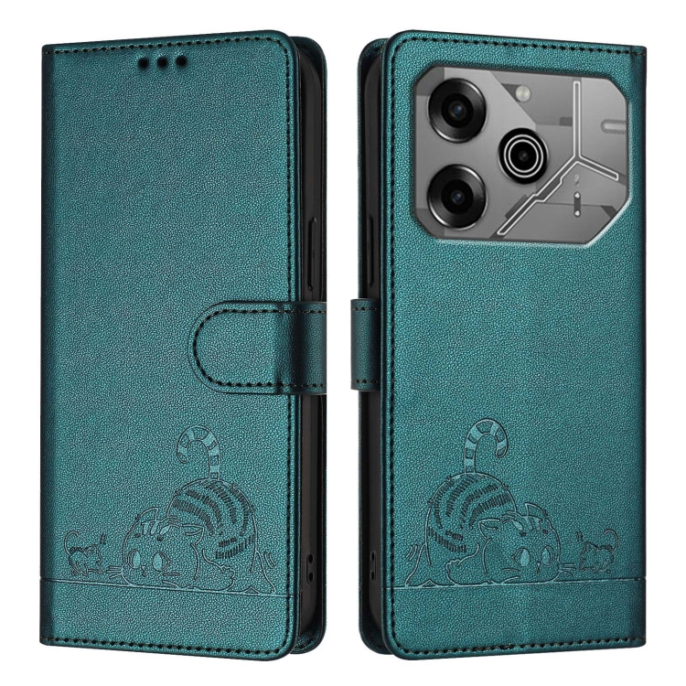 Funda Cuero Rfid Tecno Pova 6 Neo con Cordón Patrón Gato y Rata (Verde Pavo Real)