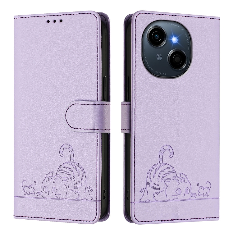 Funda de Cuero Rfid para Tecno Spark Go 1 con Cordón con Patrón en Relieve Gato y Rata (Morado)