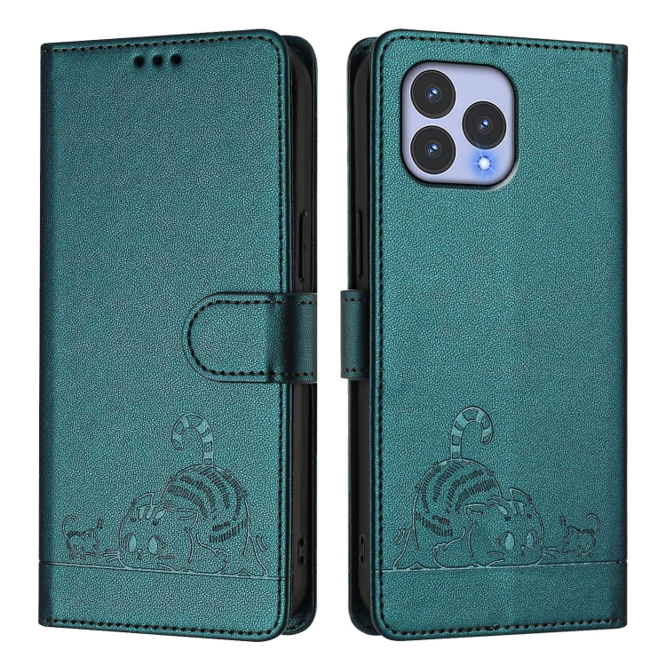 Funda de Cuero Rfid con Relieve Rata y Gato para Wiko T60 con Cordón (Verde Pavo Real)