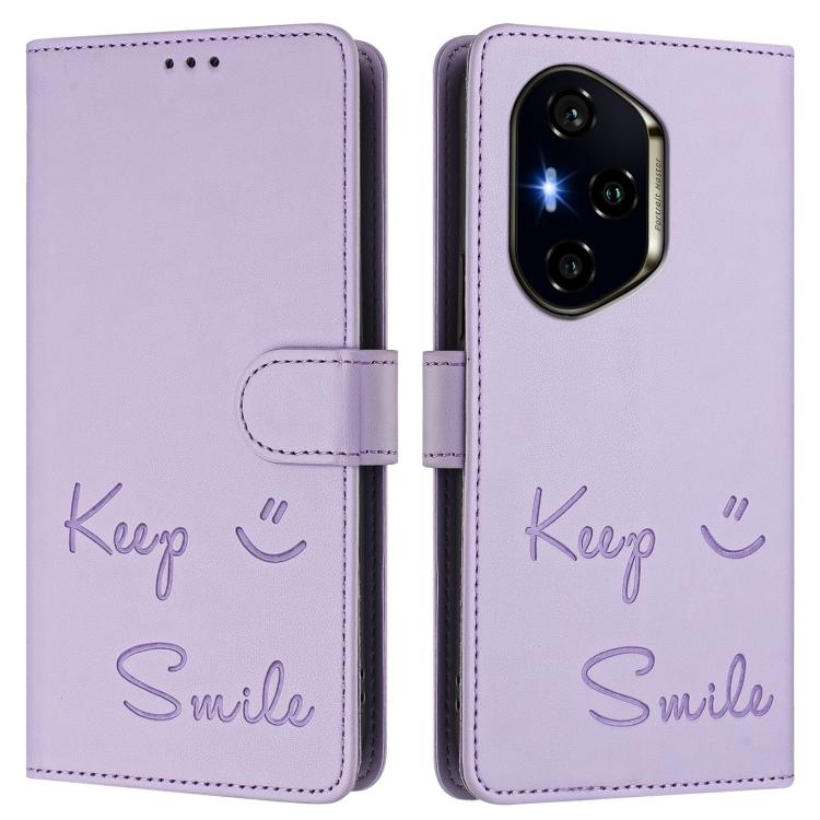 Funda de Cuero RFID con Relieve Sonriente para Honor 300 Pro 5G y 300 Ultra 5G (Morado Claro)