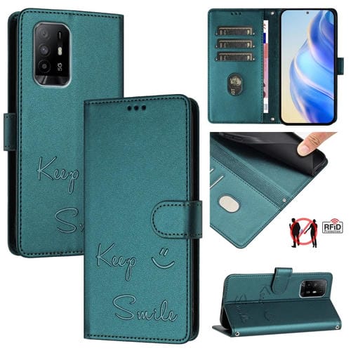 Funda de Cuero Rfid con Relieve Sonriente para Oppo A74 4G/F19/F19S (Verde Pavo Real)