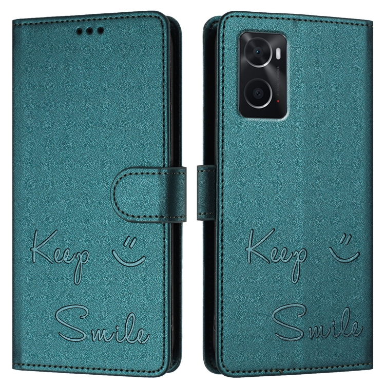 Funda de Cuero Rfid con Relieve Sonriente para Oppo A96 4G/K10 4G (Verde Pavo Real)
