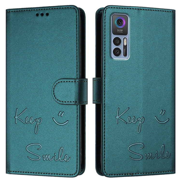 Funda de Cuero Rfid con Relieve Sonriente para TCL 30 4G/30 5G/30 Plus (Verde Pavo Real)