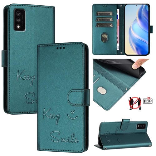 Funda de Cuero Rfid con Relieve Sonriente para TCL 30T T603Dl (Verde Pavo Real)