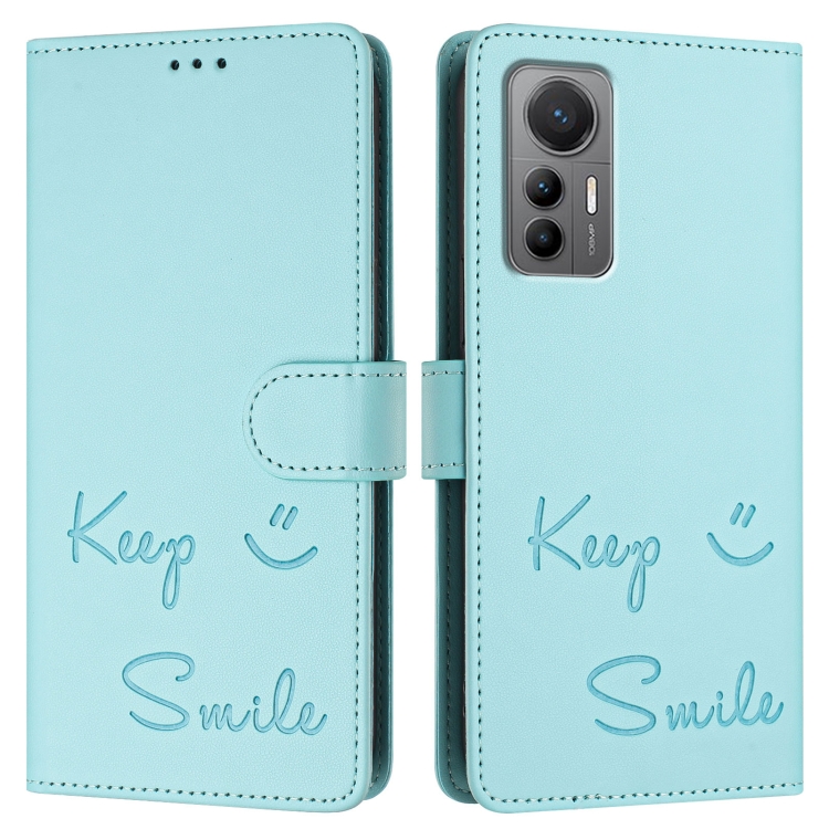Funda de Cuero Rfid con Relieve Sonriente para Teléfono Xiaomi 12 Lite (Verde Menta)