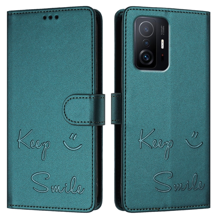 Funda de Cuero Rfid con Relieve Sonriente para Xiaomi 11T/11T Pro (Verde Pavo Real)