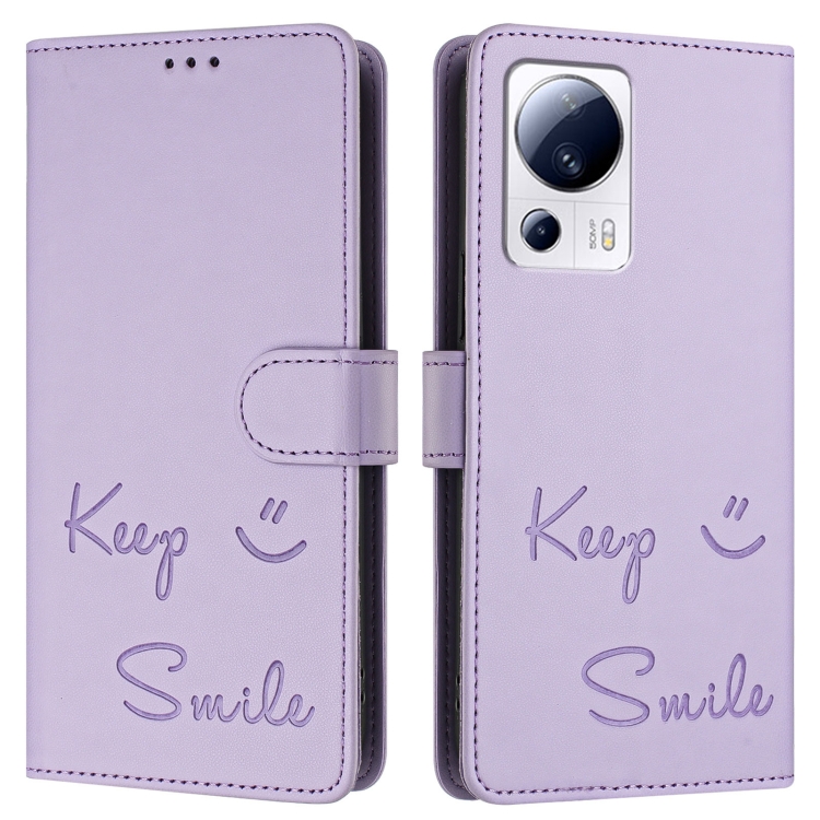 Funda de Cuero Rfid con Relieve Sonriente para Xiaomi 13 Lite/Civi 2 (Morado Claro)
