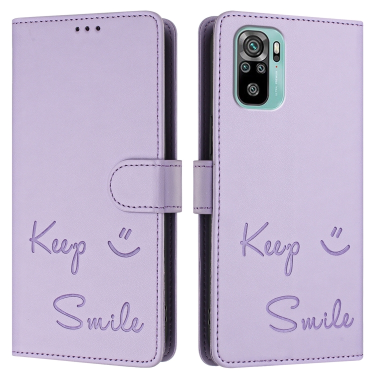 Funda de Cuero Rfid con Relieve Sonriente para Xiaomi Poco M5S (Morado Claro)