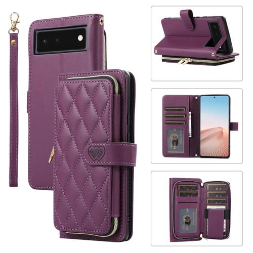 Funda de Cuero Tipo Billetera con Cremallera Completa y Diseño Romboidal para Google Pixel 6 (Morado Oscuro)