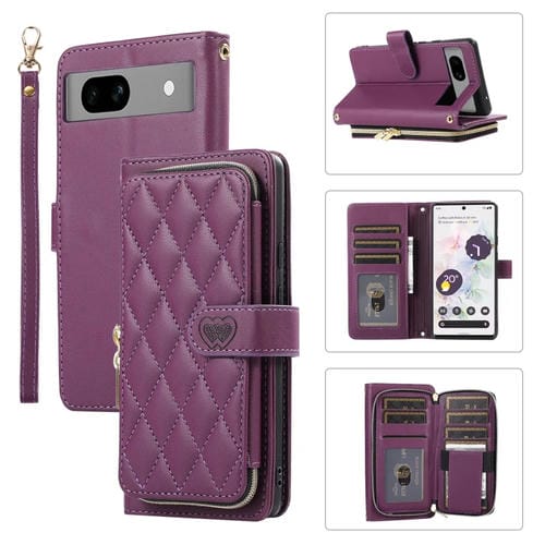 Funda de Cuero Tipo Billetera con Cremallera Completa y Diseño Romboidal para Google Pixel 7A (Morado Oscuro)