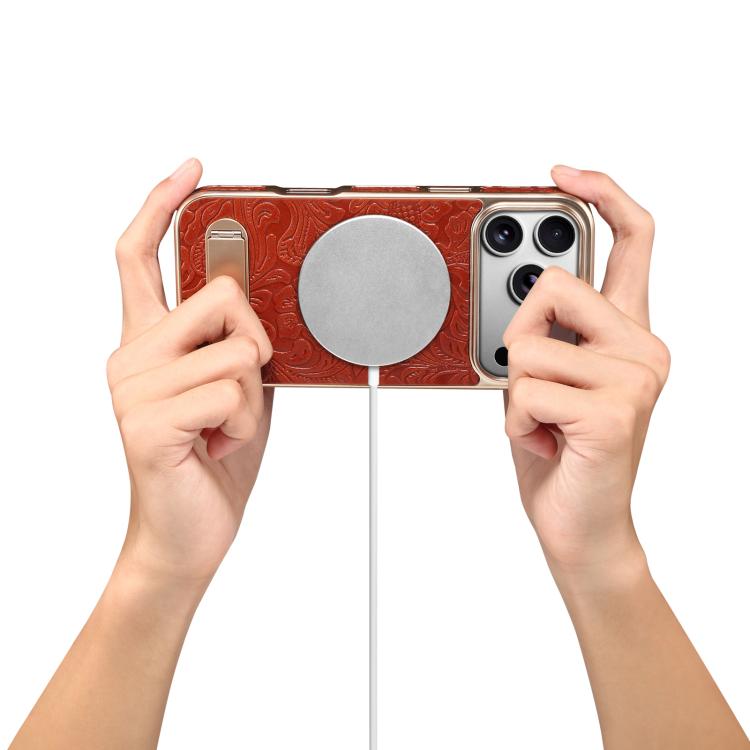 Funda de piel auténtica MagSafe con soporte para iPhone 17 Pro Max Denior A25 con textura de flores retro (rojo)