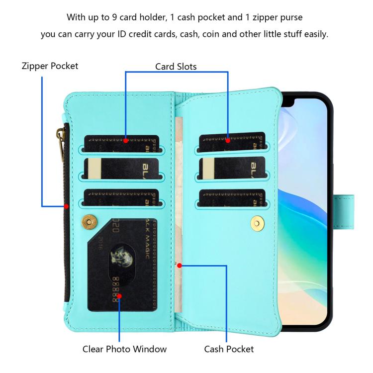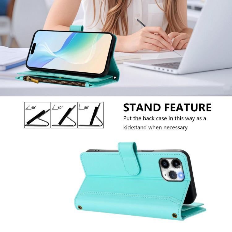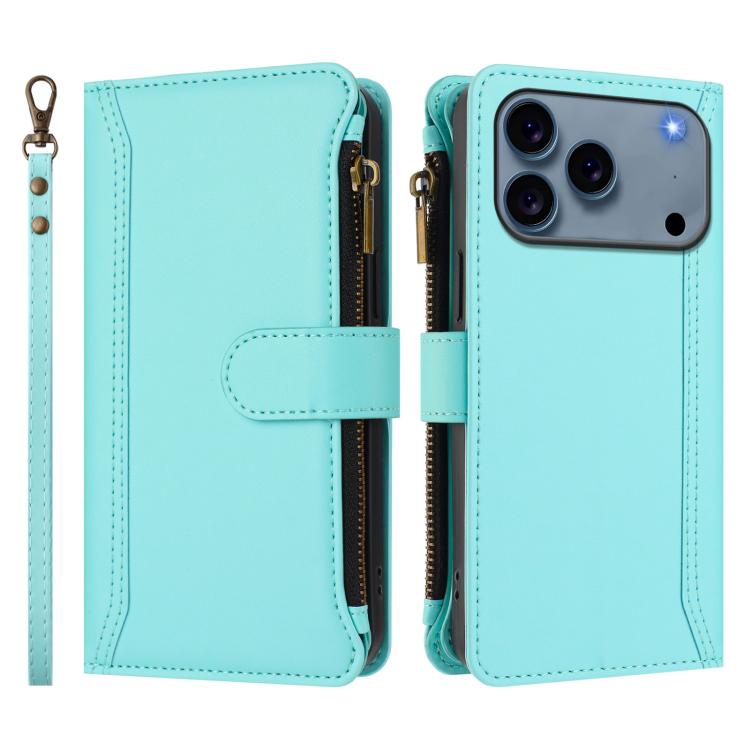 Funda de piel con cierre magnético para iPhone 17 Pro, 9 ranuras para tarjetas, cremallera y correa de mano (verde menta)