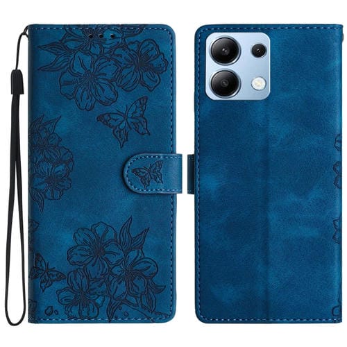 Funda de Teléfono de Pu con Relieve de Piel de Mariposa y Diseño de Flor de Cerezo para Redmi Note 13 4G (Azul)