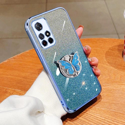 Funda de Teléfono de TPU con Soporte de Mariposa con Purpurina Degradada Chapada para Redmi Note 11 5G (Azul Sierra)