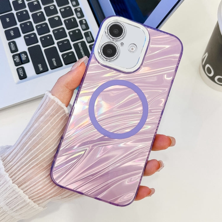 Funda de Teléfono TPU Magsafe para iPhone 16 con Película de Lente Brillo (Ondas de Agua Moradas)