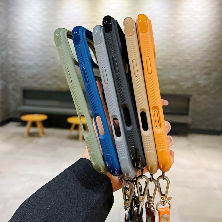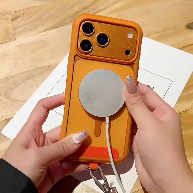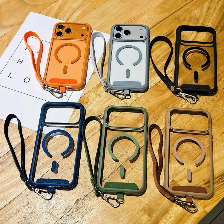 Funda magnética MagSafe transparente con borde liso y correa para la muñeca para iPhone 17 Pro Max (verde militar)