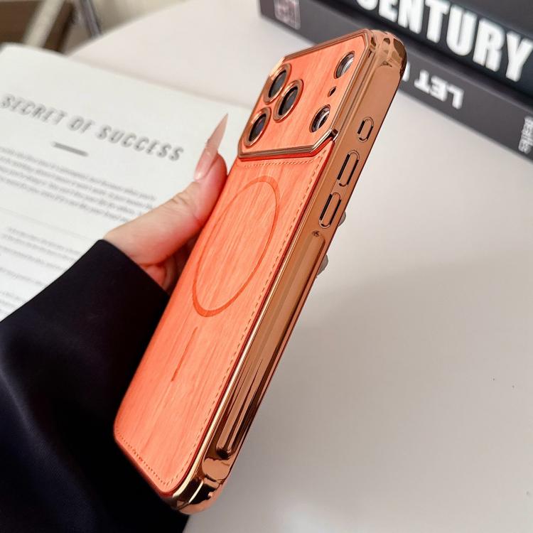 Funda MagSafe para iPhone 17 Pro Max con ventana grande de TPU, galvanizada, con textura de madera y película para lente (naranja)