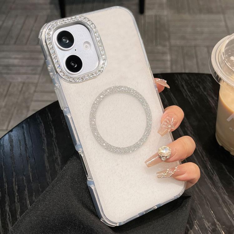 Funda MagSafe semitransparente con purpurina y bordes redondeados para iPhone 17 (blanca)
