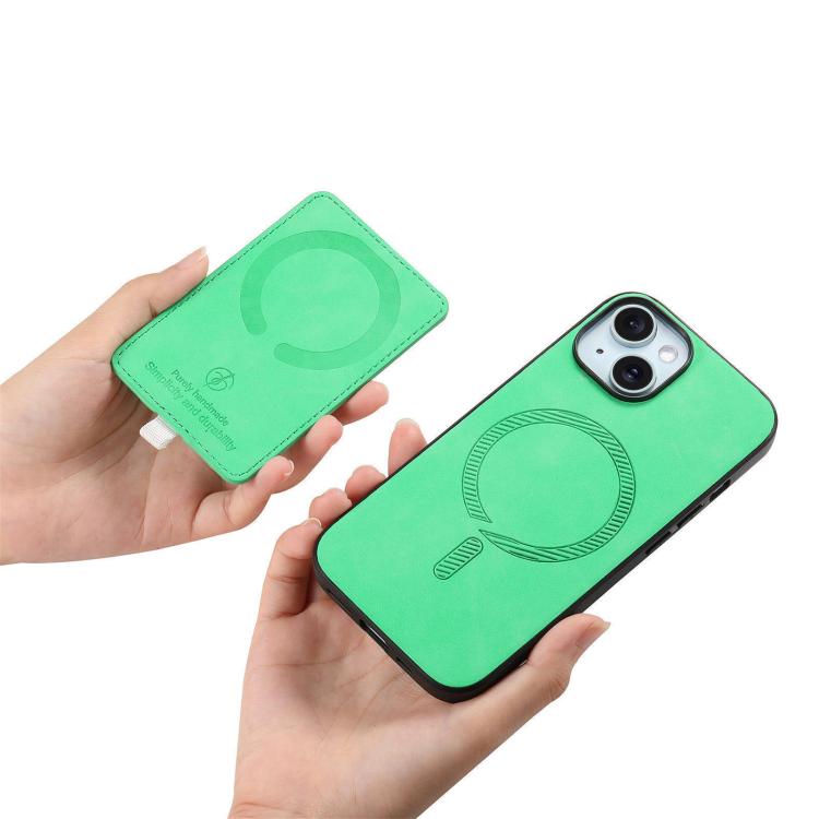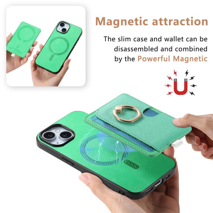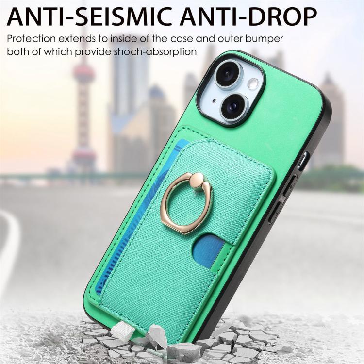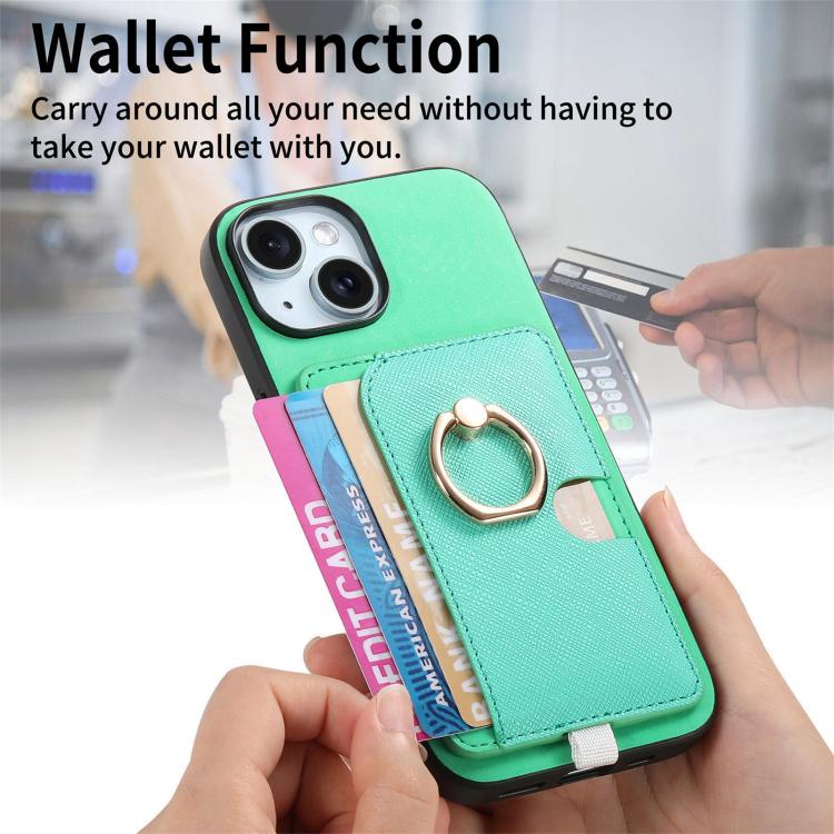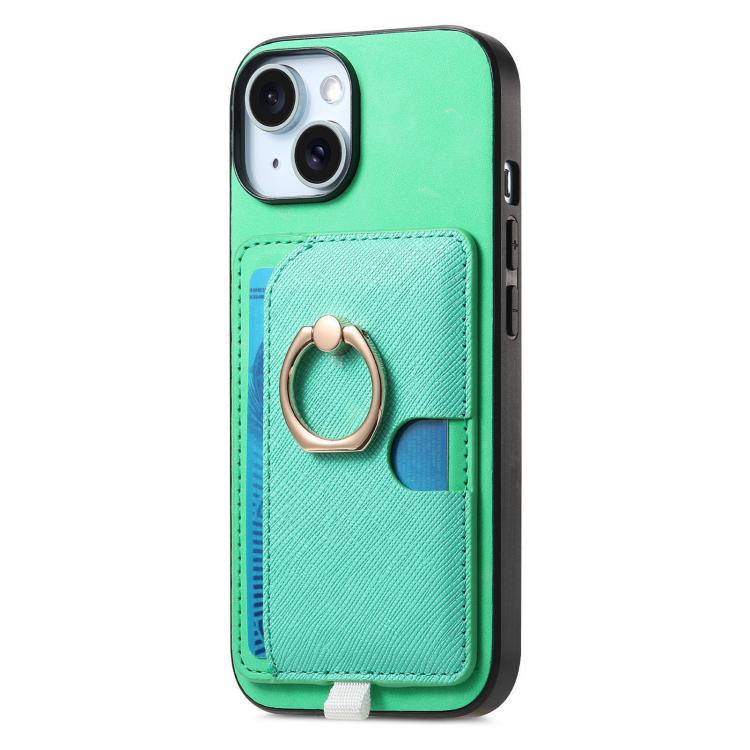 Funda para iPhone 15 Plus Cuero con Ranuras para Tarjetas y Anillo Diseño Retro Cruzado (Verde)