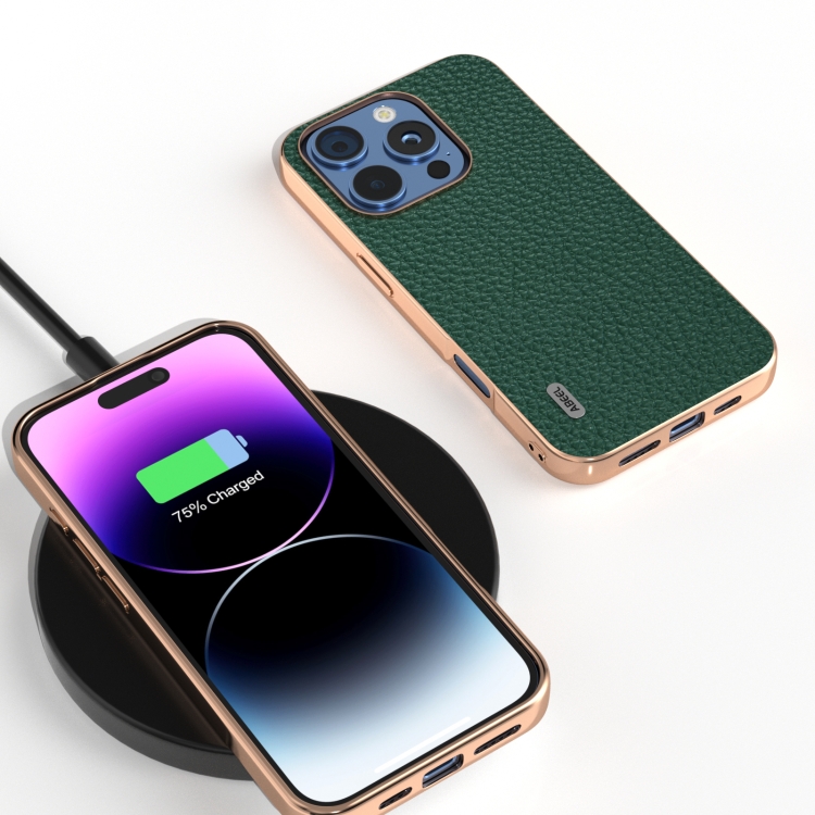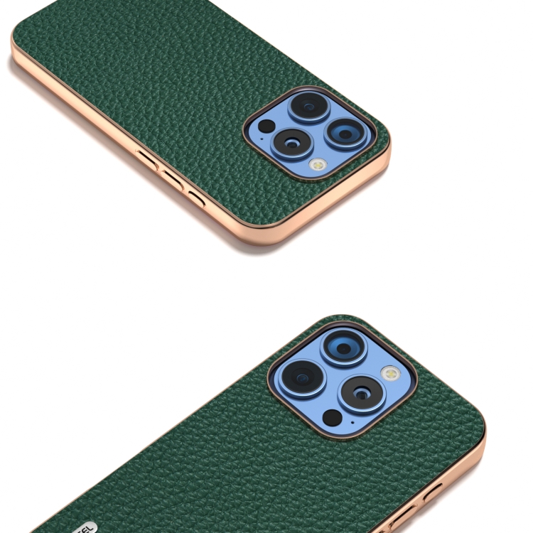 Funda para iPhone 16 Pro Max Abeel Cuero Genuino Marco Galvanizado Textura de Lichi (Verde)