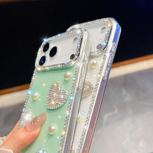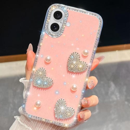 Funda para iPhone 17 con diseño de corazón de perla y purpurina de diamante, a prueba de golpes en cuatro esquinas (rosa claro)