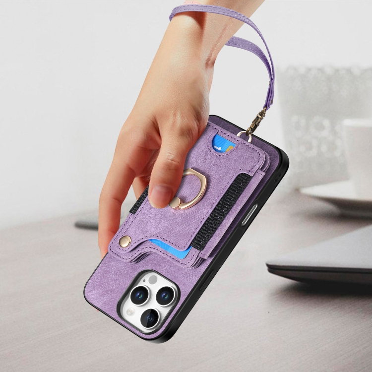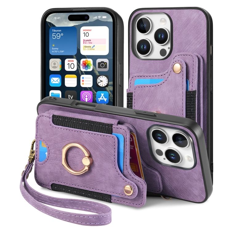 Funda para Teléfono iPhone 16 Pro Max Billetera MultiTarjeta Piel Sintética Anillo (Morado)