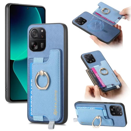 Funda para Teléfono con TaRJetero y Anillo de Cuero con Diseño Retro Magsafe Cross para Xiaomi 13T/13T Pro (Azul)