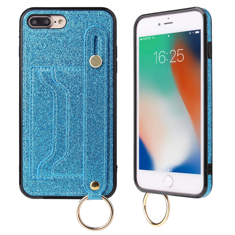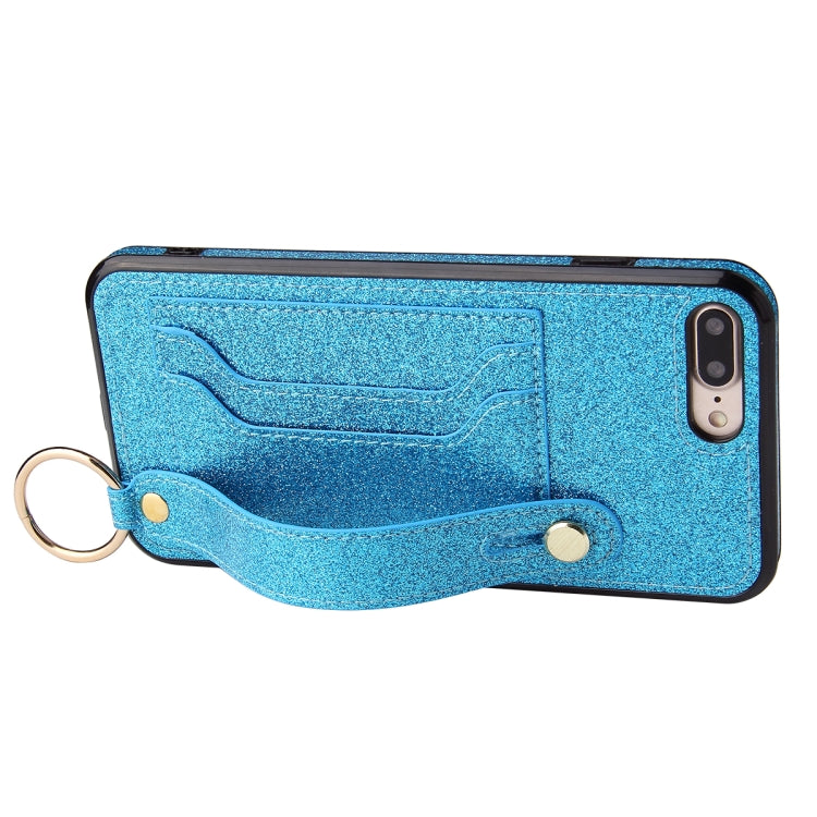 Funda Protectora Glitter Powder Pu + TPU para iPhone 8 Plus 7 Plus con Soporte Ranuras Tarjetas Correa Muñeca (Azul)