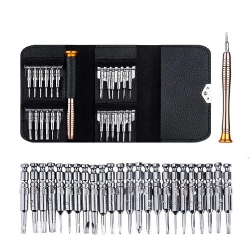 - Incluye 25 puntas: Phillips (1.0, 1.2, 1.5, 2.0, 3.0), Ranurado (1.0, 1.5, 2.0, 3.0), Torx (T2 a T15), Pentágono (0.8, 1.2), Tri-Wing (2.3), Triángulo (2.0), cabeza de llave inglesa (3.0) y destornillador redondeado (0.8)