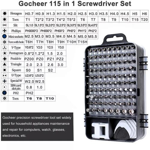 • Conjunto de 115 Piezas que incluye 98 puntas de precisión (Hexagonal, Philips, Cruz, Menos, Torx, Seguridad Torx, Destornillador de tuercas, Tipo Y, Pentágono, Triángulo, Tipo U, cabeza plana, Bits cuadrados y especiales), mango telescópico, ejes de extensión, pinzas, ventosa, herramientas de palanca y accesorios para magnetización y extracción de Tarjetas SIM