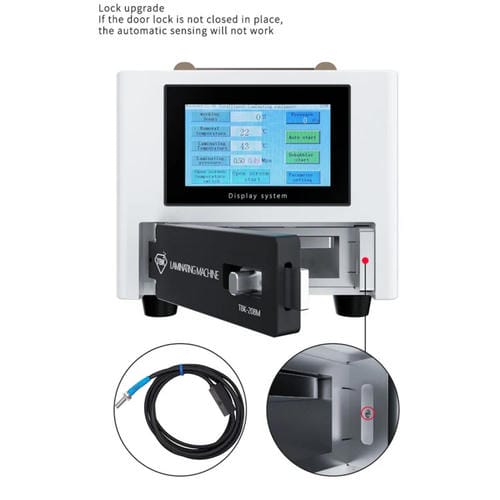• Funciones 3 en 1: laminación al vacío, eliminación de burbujas y separación; Pantalla Táctil LCD; bomba de vacío y compresor de aire integrados; presión constante inteligente; Cubierta de bloqueo automático; Enchufe Reino Unido