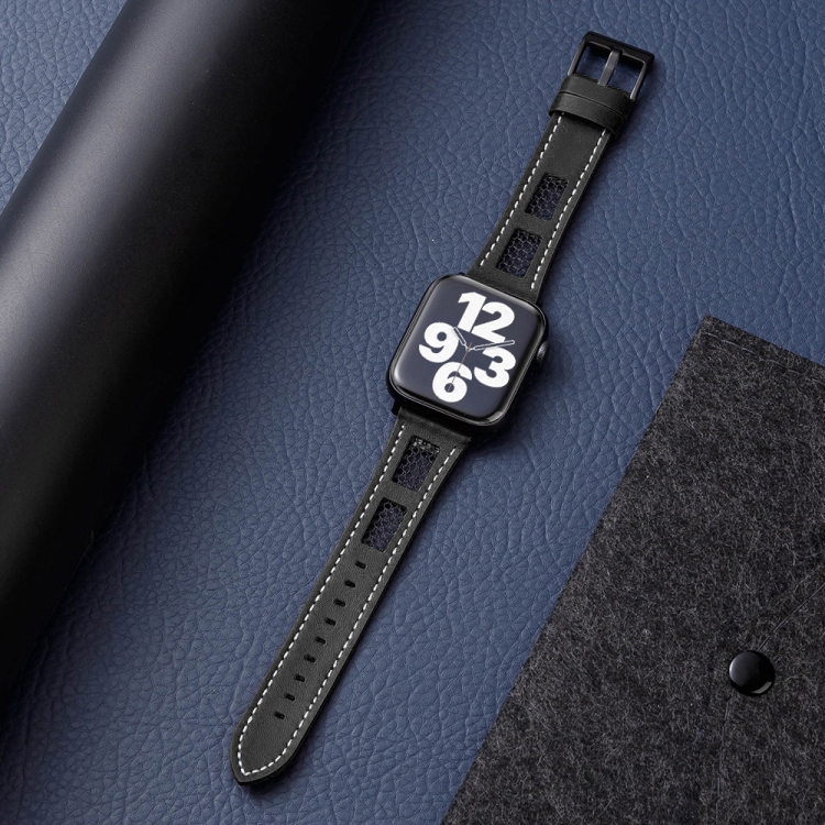 Correa de Cuero Genuino para Apple Watch SE 44mm Malla de Piel de Becerro (Negro)