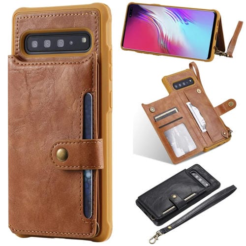 Estuche Protector Galaxy S10 5G a Prueba de Golpes con Cremallera Hebilla Soporte Ranuras Tarjetas Billetera Cordón Marco Fotos (Marrón)