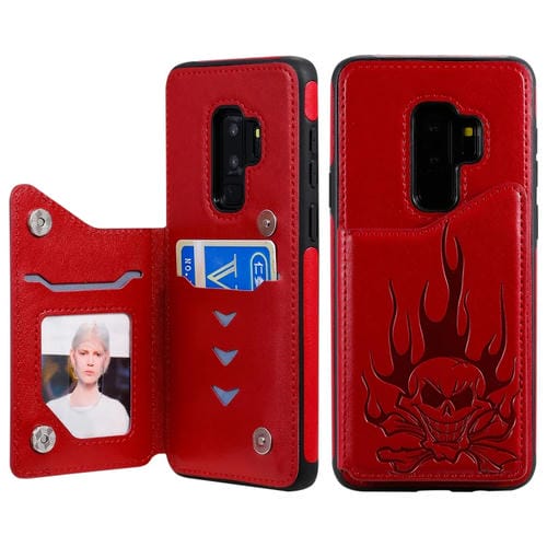 Estuche protector Galaxy S9 + Patrón Cráneo Estampado En Relieve a Prueba de Golpes con Soporte y Ranuras para Tarjetas y Billetera (Rojo)