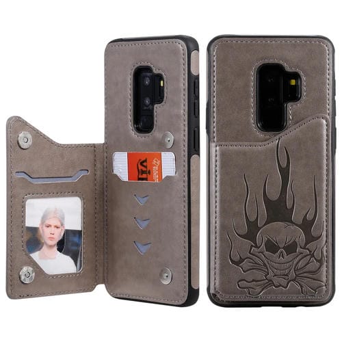 Estuche protector Galaxy S9 + patrón cráneo grabado en relieve a prueba de golpes con soporte y ranuras para tarjeta y billetera (Gris)