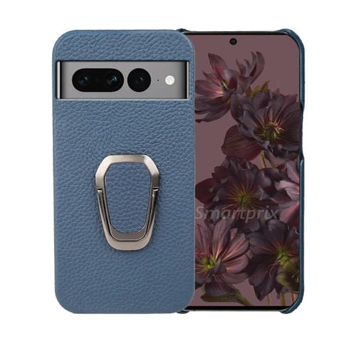 Funda de Cuero Genuino para Google Pixel 7 Pro con Ring Holder y Textura Litchi (Azul)