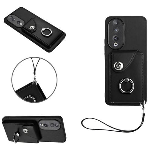For Honor 90 PU Phone Case with Ring Holder and Organ Card Bag with Lanyard(Black)