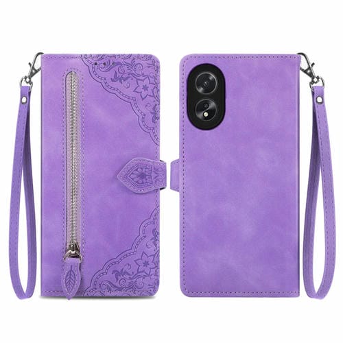 Funda para Honor X5 Plus de Cuero con Cremallera y Flores en Relieve (Púrpura)