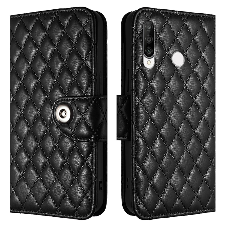- 1x Funda para Huawei P30 Lite Nova 4E con Tapa de Cuero textura rómbica y cordón (Negro)
