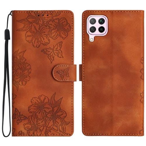Funda para Huawei P40 Lite Cherry Blossom Butterfly Skin Feel de PU en Relieve (Marrón)